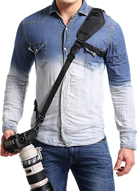 It supports cross-body sling shooting,so you can easily move the camera in one swift motion. The strip also features an underarm stabilizing strap. Overall it makes the best companion for sports shooters.