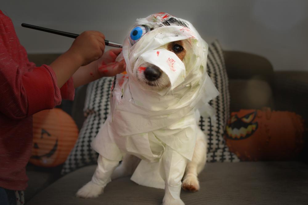 If you want to turn your pet into a mummy, there are several cheap and easy ways to do so. You can wrap gauze around your dog’s body and then use bandages to cover the gauze. Then add a head wrap and fake beard if desired. Decorate with fake blood if you want an extra creepy effect!