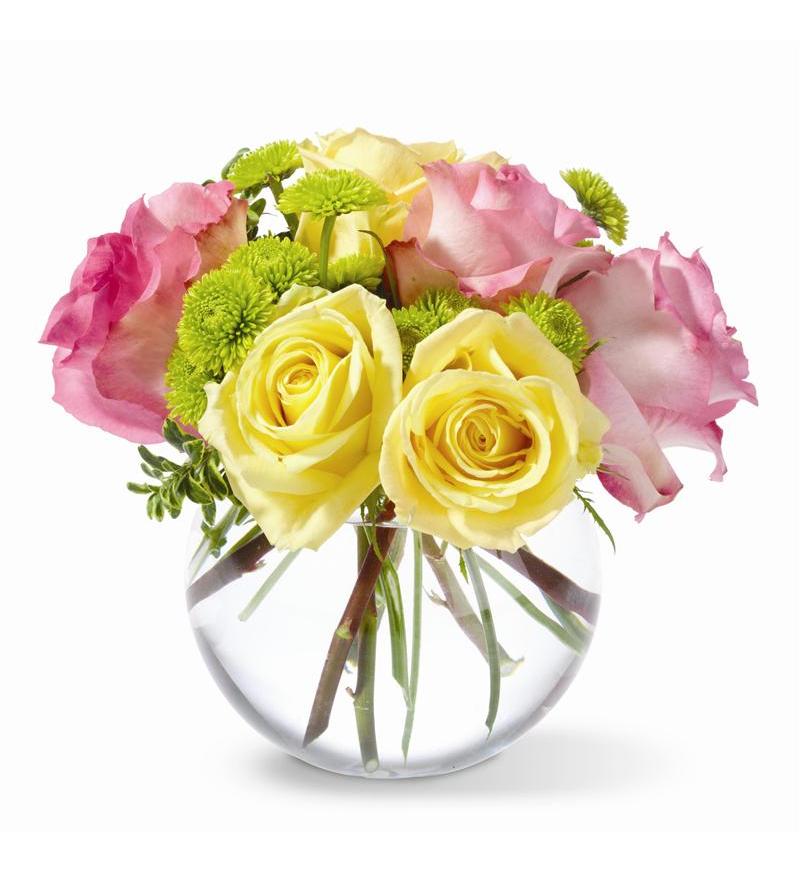 Show six roses deluxe nine roses Premium a dozen roses pink and yellow roses, green button chrysanthemums, and delicate oregonia are arranged in a transparent glass bubble bowl. Buy your Teleflora’s Pink Lemonade Roses at a 10% discount by using FlowerShopping.com promo codes.