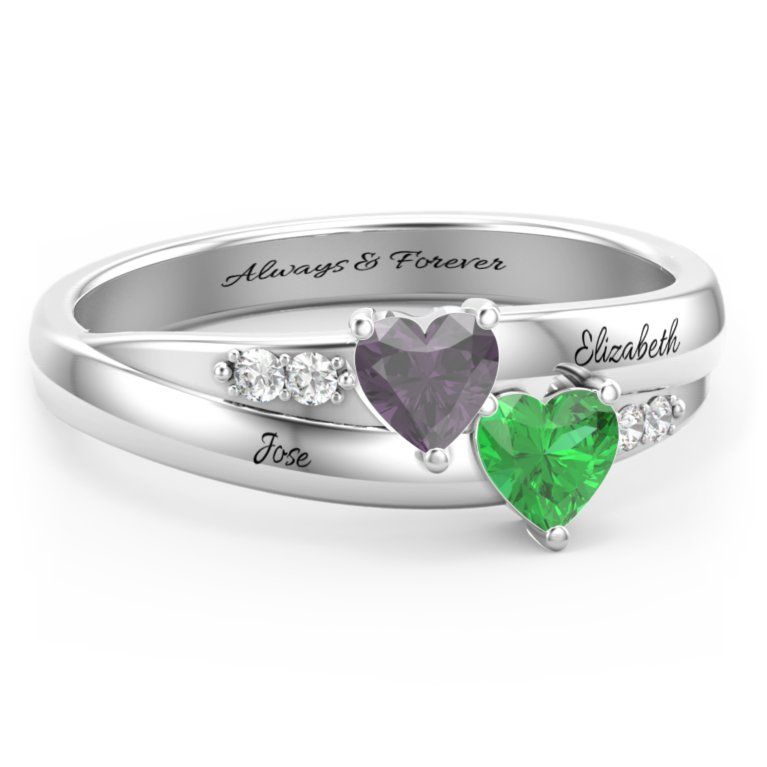 Stunning accent stones complement two heart-shaped gemstones. This Double Heart Gemstone Ring with Accents is manufactured to order in your choice of silver or gold and represents unity. Choose two 4x4mm heart-cut birthstones for this gift, and then add genuine diamonds or Brilliance cubic zirconia accents to make it truly unique. Get your ring today and get a 10% discount by using Jewlr Coupon Codes.