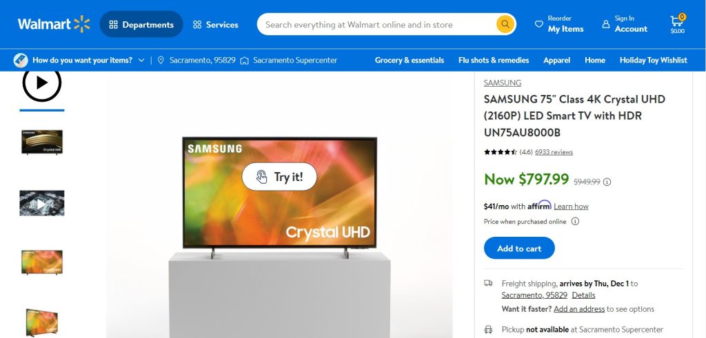The Samsung 75-inch 4K Ultra HD Smart TV is available for $1,997.99 at Walmart. This TV has a 240Hz refresh rate, which means it will be able to deliver smooth video even when you’re watching fast-moving action scenes in your favorite movies and TV shows. The resolution is 3840 x 2160 pixels, so you can enjoy crisp images on this large display. The screen size of 75 inches makes it perfect for a large room or even an outdoor patio if you have one that’s covered by a roof that can handle the weight of such a large piece of technology!