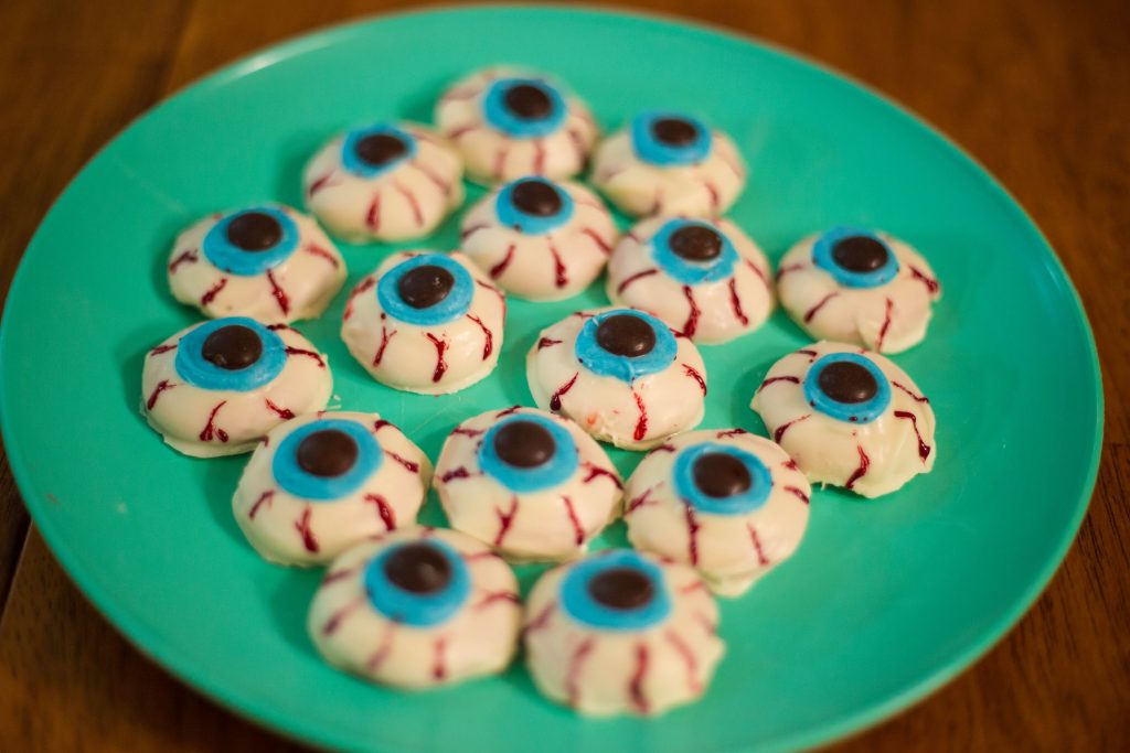 Eyeball cookies are a spooky and fun treat that is perfect for a freaky dinner party this Halloween. Eyeballs are made from white chocolate, which is molded into the desired shape and then tinted with food dye to give them the desired color. Once your eyes have been created, they need to be filled with jam or jelly before the white chocolate sets. The eyes should be placed on a tray lined with parchment paper and chilled until ready to serve. You can also serve one of the best cookies that are Cheryl’s cookies.